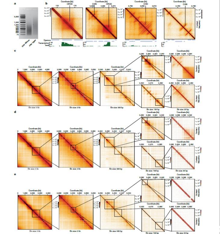 圖1、超高分辨率Micro-C圖譜揭示了大腸桿菌基因組的復(fù)雜3D組織。a)在Micro-C程序的不同步驟后對DNA進行瓊脂糖凝膠電泳,展示了超高分辨率映射所需的片段化模式。b)Micro-C接觸圖示例,顯示OPCID、CHIN和CHID以及轉(zhuǎn)錄活性譜和縱子軌跡。c-e,Micro-C和Hi-C數(shù)據(jù)比較:正常生長條件下WT大腸桿菌細(xì)胞生成的Micro-C圖譜(c);使用標(biāo)準(zhǔn)Hi-C協(xié)議在相同細(xì)胞上生成的Hi-C接觸圖(d);大腸桿菌MG1655(e)的Hi-C圖譜。