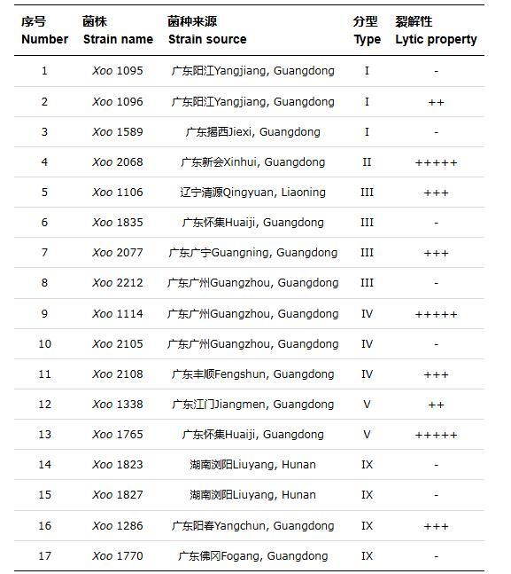 本研究所使用的17株白葉枯病菌(表1)由廣東省農(nóng)業(yè)科學(xué)院植物保護(hù)研究所提供。在廣東省廣州市南沙區(qū)大崗鎮(zhèn)下坦村水稻種植基地的稻蝦田中采集水樣5 L用于噬菌體分離。