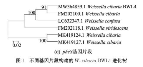 本文將16S rDNA、dnaA、atpA、pheS 基因片段測序得到的基因序列與NCBI數(shù)據(jù)庫進(jìn)行比對,選取同種部分菌屬序列進(jìn)行下載,使用分子進(jìn)化遺傳分析軟件MEGA 7.0,采用Neighbor-Joining法自舉1000次構(gòu)建親緣進(jìn)化樹。