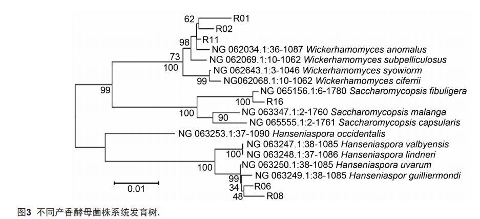 本研究從新鮮的果皮、枝梗和大曲中共分離出16株具有典型酵母特征的菌株。經(jīng)嗅聞法初篩、總酯測定復篩和分子生物學鑒定為6株產(chǎn)香酵母,經(jīng)鑒定發(fā)現(xiàn)R01、R02、R11為異常威克漢姆酵母(Wickerhamomyces anomalus);R06、R08為季也蒙有孢漢遜酵母(Hanseniaspora guilliermondii);R16為扣囊復膜酵母(Saccharomycopsis fibuligera)。