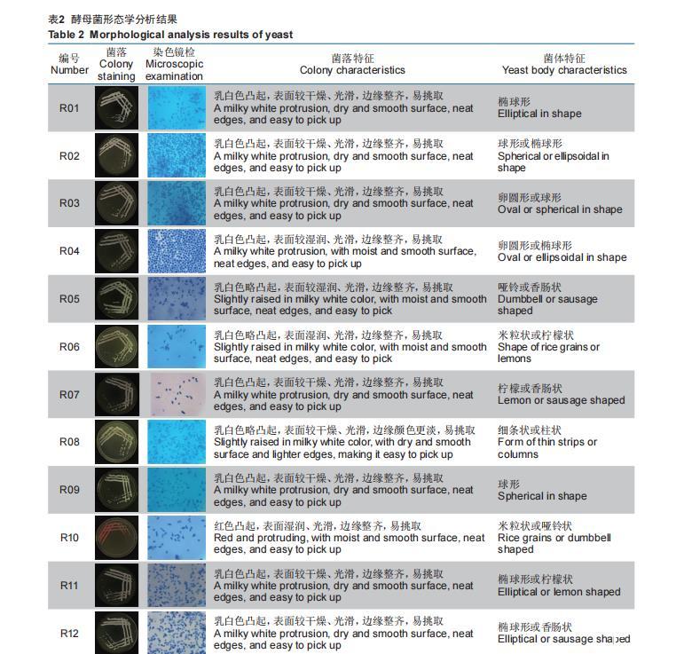 參照《真菌鑒定手冊》和《酵母菌的特征與鑒定手冊》,對分離純化出的菌株進行形態(tài)學、生理生化鑒定。酵母菌菌落多數(shù)呈乳白色,極少數(shù)為紅色,個別為黑色。酵母菌的菌落表面大多數(shù)光滑、濕潤、黏稠,容易被挑起;小部分干燥、覆蓋有細小絨毛,難以挑取。酵母菌的菌體形態(tài)各樣,包括球狀、卵圓形、橢球形、柱狀、香腸狀等。通過對酵母菌菌落特征觀察和染色鏡檢,確定出16株具有典型酵母特征的菌株,其菌落、菌體形態(tài)和酵母菌形態(tài)學分析結(jié)果見表2。