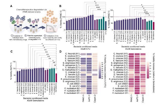 圖2、IPMN衍生菌株代謝5-FU和吉西他濱,改變胰腺癌細(xì)胞對(duì)藥物的敏感性。A)細(xì)菌降解化療藥物的實(shí)驗(yàn)設(shè)置示意圖。5-FU和吉西他濱與個(gè)別細(xì)菌菌株一起孵育4小時(shí)。孵育后,通過(guò)0.2μm濾膜過(guò)濾上清液。通過(guò)CCK-8實(shí)驗(yàn)評(píng)估藥物活性,并測(cè)試了4μM和40μM的指定藥物濃度。以未處理的藥物作為對(duì)照,計(jì)算相對(duì)藥物活性。B-C:在與IPMN衍生菌株、E.coli和F.nucleatum共同孵育4小時(shí)后,PANC-1和AsPC-1細(xì)胞的存活率定量分析?;熕幬?-FU和吉西他濱(40μM)首先與IPMN衍生菌株一起孵育4小時(shí),過(guò)濾、稀釋后加入癌細(xì)胞培養(yǎng)中。細(xì)胞存活率在CCK-8實(shí)驗(yàn)中測(cè)量,并在48小時(shí)后以相對(duì)于未處理細(xì)胞的百分比存活率表示。D)熱圖總結(jié)了PANC-1、AsPC-1和Capan-2細(xì)胞系相對(duì)于活性藥物處理的細(xì)胞存活率百分比增加情況。