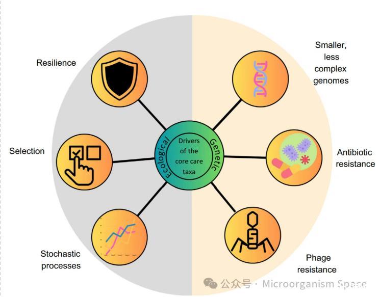 圖2|核心稀有類群持久存在的驅(qū)動因素。生態(tài)(恢復(fù)力、選擇、隨機(jī)過程)和遺傳(基因組的性質(zhì)、存在賦予噬菌體和抗生素抗性的基因島)驅(qū)動核心稀有類群持久存在的因素。核心稀有類群的恢復(fù)力和環(huán)境選擇可作為生態(tài)驅(qū)動因素,在其持久存在中發(fā)揮重要作用。此外,稀有生物群落的形成已被發(fā)現(xiàn)顯著受到諸如遺傳漂變和隨機(jī)生態(tài)相互作用等隨機(jī)過程的影響。此外,較小的基因組規(guī)模和較低的復(fù)雜性可能是核心稀有類群在所棲息的狹窄生態(tài)位中持久存在的重要遺傳決定因素。核心稀有類群成員中存在的基因島可以編碼抗生素抗性基因,這可能進(jìn)一步幫助其中一些生物與豐富類群競爭并持久存在。