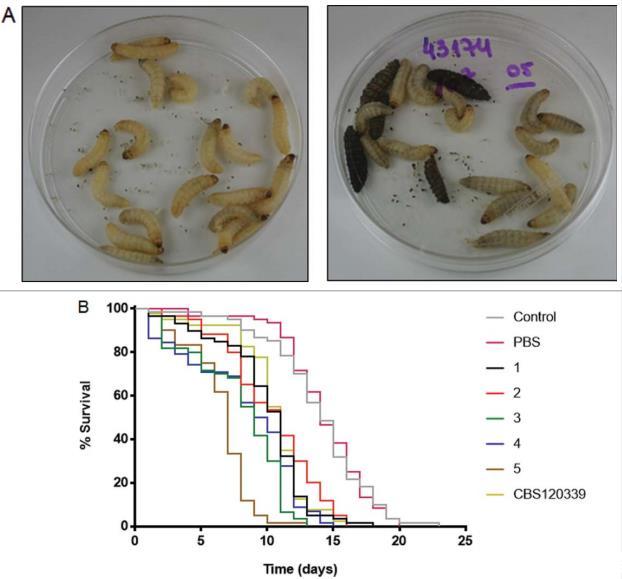 通過(guò)用107個(gè)酵母細(xì)胞攻擊幼蟲,進(jìn)行了大蠟螟幼蟲的體內(nèi)實(shí)驗(yàn)。與對(duì)照組相比,接種酵母的幼蟲色素沉著增強(qiáng)(圖4A)。獲得了3個(gè)獨(dú)立實(shí)驗(yàn)的生存曲線。與對(duì)照組相比,所有分離株都降低了幼蟲的存活率(P<0.0001),但與注射分離株5的幼蟲組相比,這種降低始終顯著更高。圖4B顯示了3個(gè)實(shí)驗(yàn)合并數(shù)據(jù)的生存曲線,其中分離株5的中位生存期為7天,而其他分離株為9-11天(P<0.0001)。未感染對(duì)照組的中位生存期為14天。我們還用104和106個(gè)酵母進(jìn)行了實(shí)驗(yàn),但在這些接種量下,幼蟲的存活率與未感染對(duì)照組相似(數(shù)據(jù)未顯示)。