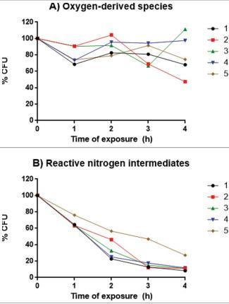其他時(shí)間間隔的差異不顯著。暴露于活性氮中間體降低了分離株的存活率,但分離株5的存活率在檢查時(shí)間內(nèi)始終高于其他分離株。然而,這些差異不顯著(圖6B)。