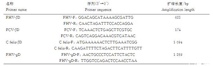 利用AxyPrep病毒核酸提取試劑盒提取病料拭子核酸,分別用FHV-1、FCV、貓衣原體(chlamydophila felis,C felis)的特異性鑒定引物進行檢測,引物序列見表1,由庫美生物科技有限公司合成。FCV的反轉錄體系及程序參照PrimeScriptTM RT reagent Kit with gDNA Eraser(Perfect Real Time)試劑盒說明書。FHV-1、FCV和C felis的PCR擴增體系為:2×Taq Plus Master MixⅡ(Dye Plus)10μL,ddH2O 6μL,上、下游引物各1μL,模板2μL,共20μL。PCR擴增程序為:95℃預變性3 min;95℃變性30 s,58℃退火30 s,72℃延伸1 min,共32個循環(huán);72℃終延伸10 min,4℃保存。PCR產物進行1%瓊脂糖凝膠電泳鑒定。