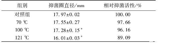 如表2所示,經(jīng)70℃處理20 min后,SCB2505代謝物對(duì)液化沙雷氏菌SCB2649菌株的抑菌效果與對(duì)照組相比無顯著差異(P>0.05),而100℃和121℃處理后的代謝物抑菌效果顯著下降(P<0.05),但相對(duì)抑菌活性仍有90%左右保留。說明植物乳桿菌SCB2505代謝物中抑菌活性物質(zhì)具有較好的耐熱性,但可能其中有部分抑菌物質(zhì)對(duì)熱較為敏感。