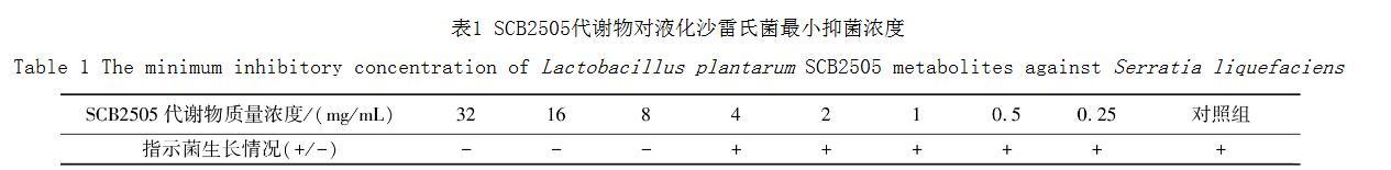 由表1可知,對(duì)于液化沙雷氏菌SCB2649菌株,植物乳桿菌SCB2505代謝物質(zhì)量濃度為4 mg/mL時(shí),液體培養(yǎng)基渾濁,指示菌液化沙雷氏菌SCB2649菌株有明顯的生長(zhǎng)現(xiàn)象發(fā)生,但質(zhì)量濃度為8 mg/mL的試管中液體清澈,指示菌SCB2649菌株無明顯的生長(zhǎng)現(xiàn)象,因此植物乳桿菌SCB2505代謝物對(duì)該指示菌的MIC可確定為8 mg/mL。