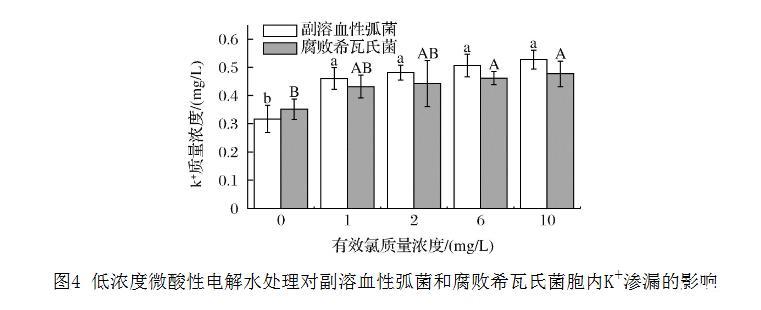 圖4 低濃度微酸性電解水處理對(duì)副溶血性弧菌和腐敗希瓦氏菌胞內(nèi)K+滲漏的影響