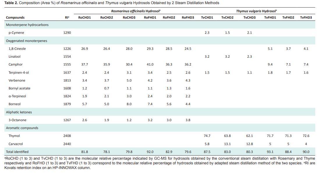在6批百里香精油中,鑒定出9種化合物,在蒸汽蒸餾獲得的精油中占86.5%至87.2%,在適應(yīng)式蒸汽蒸餾獲得的精油中占85.7%至86.6%。在蒸汽蒸餾和適應(yīng)式蒸汽蒸餾獲得的水餾液中,鑒定出5種化合物,分別占80.3%至87.5%和88.4%至93.1%。