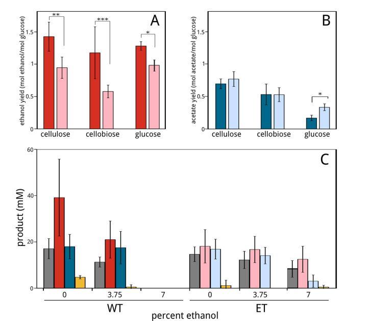 本文中,我們試圖通過連續(xù)傳代到遞增的乙醇濃度中,開發(fā)一株具有提高乙醇耐受性的C. phytofermentans菌株,并表征其生長和發(fā)酵特性。我們對ET菌株基因組進行了測序,以揭示適應過程中出現的基因組突變,并通過異源表達替代乙醇形成途徑來克服ET菌株乙醇產量降低的問題。我們討論了本研究的結果如何增進我們對微生物如何適應乙醇等溶劑高濃度的理解。