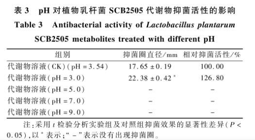 表3 pH對植物乳桿菌SCB2505代謝物抑菌活性的影響