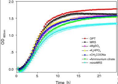 解讀:上圖正是Bioscreen C測(cè)定后得到的關(guān)鍵結(jié)果。這張生長(zhǎng)曲線圖直觀地展示了鼠李糖乳桿菌ZY在原始MRS培養(yǎng)基、優(yōu)化后的培養(yǎng)基(OPT)以及缺乏某些微量元素的培養(yǎng)基中的生長(zhǎng)情況??梢悦黠@看到,優(yōu)化后的培養(yǎng)基(紅色圓點(diǎn))能獲得最高的生物量,而移除所有微量元素的“迷你MRS”培養(yǎng)基(青綠色圓點(diǎn))則嚴(yán)重抑制了細(xì)菌的生長(zhǎng)。