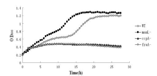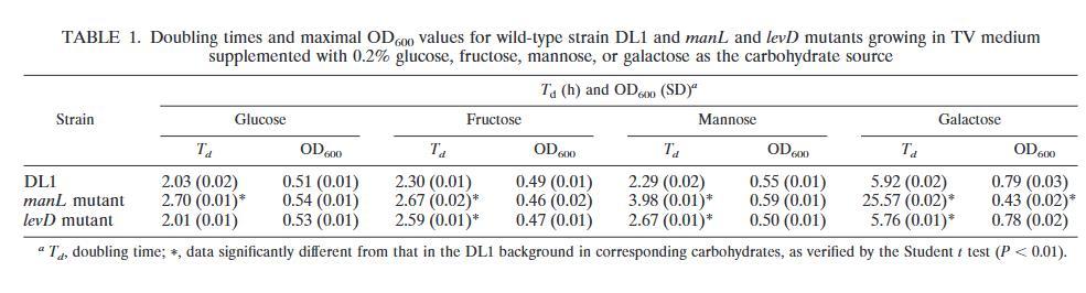戈登氏鏈球菌manL和levD突變體的表征。為了評(píng)估m(xù)anL和levD在戈登氏鏈球菌中的功能,使用非極性em盒在DL1株背景下構(gòu)建了等位基因替換突變體。為了確定manL和levD在碳水化合物轉(zhuǎn)運(yùn)中的作用,使用Bioscreen C監(jiān)測(cè)了野生型菌株以及manL和levD突變體在補(bǔ)充了0.2%葡萄糖、果糖、甘露糖或半乳糖的TV培養(yǎng)基中的生長(zhǎng)。與野生型菌株相比,manL突變體在葡萄糖和甘露糖中的生長(zhǎng)速率較慢,在半乳糖中顯著減慢,但在果糖上僅略微減慢(表1),表明ManL可能參與戈登氏鏈球菌對(duì)葡萄糖、甘露糖和半乳糖的攝取。相反,levD突變體在存在果糖或甘露糖的情況下生長(zhǎng)比DL1慢,這表明LevDEFG在這些己糖的轉(zhuǎn)運(yùn)中起作用。當(dāng)在葡萄糖中生長(zhǎng)時(shí),野生型菌株和levD突變體之間的倍增時(shí)間沒有顯著差異。