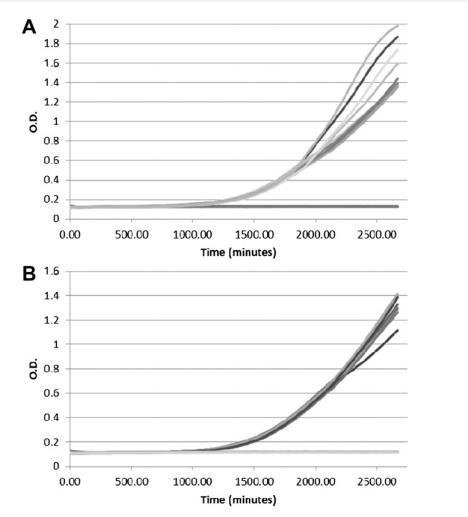 當(dāng)使用固體培養(yǎng)基(0.5-2%瓊脂w/v)時(shí),表面接種和針接種孢子懸浮液到培養(yǎng)基中導(dǎo)致真菌生長(zhǎng)。然而,從Bioscreen獲得的O.D.時(shí)間^-1曲線給出高變異性。重復(fù)孔之間和不同重復(fù)實(shí)驗(yàn)之間的變異性高(數(shù)據(jù)未顯示)。液體培養(yǎng)基提供良好生長(zhǎng)產(chǎn)量和較少變異性,但重復(fù)孔和重復(fù)實(shí)驗(yàn)之間仍有顯著差異。