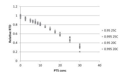在模型中,Po取決于環(huán)境條件,除了PTS。此外,作為環(huán)境因素獨(dú)立性的證明,相對(duì)RTD對(duì)PTS濃度的表示已繪制(圖7)。這顯示所有數(shù)據(jù)落在同一線上,證明真菌行為對(duì)相同PTS濃度相似。7天后,MIC值準(zhǔn)確預(yù)測(cè)在YES平皿中50 ppm PTS下未觀察到生長(zhǎng)。