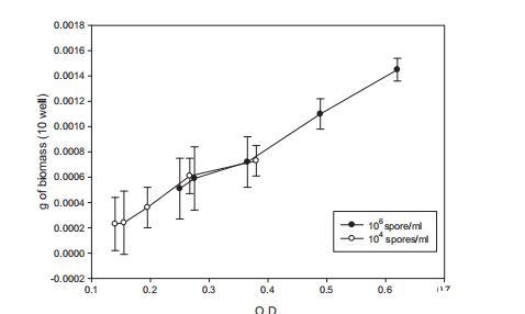 微孔板含50孔加載400μl YES接種1x10^6和1x10^4孢子/毫升黃曲霉,培養(yǎng)后每小時(shí)后計(jì)算生物量,初始培養(yǎng)13小時(shí)后。兩種濃度生物量對(duì)O.D.讀數(shù)結(jié)果如圖5所示。通常,生物量隨O.D.增加而增加。當(dāng)兩種初始濃度達(dá)到相似O.D.讀數(shù)時(shí),獲得的生物量幾乎相同,表明O.D.和生物量之間直接關(guān)系。