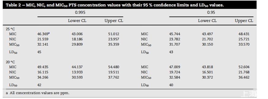 表2:PTS濃度值的MIC、NIC和MIC50及其95%置信限和LD50值。