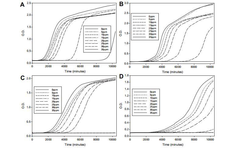 與LD50值相比,獲得的MIC50濃度始終小于使用基于延伸速率的傳統(tǒng)方法計(jì)算的值。而LD50值,比較菌落生長(zhǎng)速率,范圍從40到45 ppm,MIC50值,基于比較菌絲生物量,范圍從32到34 ppm。部分原因可能在于MIC50使用計(jì)算的劑量響應(yīng),而LD50計(jì)算缺少這一點(diǎn)。