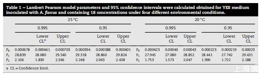盡管觀察到Po值差異(表明不同環(huán)境對(duì)在沒(méi)有抑制劑情況下達(dá)到O.D.=0.2所需時(shí)間的影響),參數(shù)P1和P2在統(tǒng)計(jì)上無(wú)差異(P>0.05)。這表明盡管獲得的菌絲量不同(20°C vs 25°C和aw 0.995 vs 0.95),PTS的效果在不同條件下保持相同。PTS的效果在此短范圍內(nèi)獨(dú)立于溫度和aw。