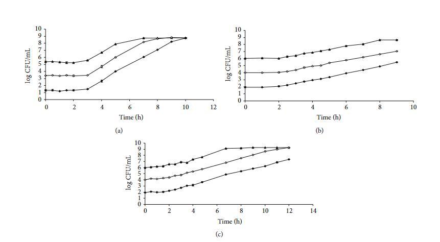 為了雙重檢查獲得的結(jié)果,使用五種生長模型對這些相同微生物的幾條平板計數(shù)生長曲線進行了建模。圖3顯示了蠟樣芽孢桿菌INRA-AVTZ 415在30°C BHI中(a)、單核細胞增生李斯特菌CECT 4031在37°C TSB+YE中(b)和大腸桿菌CECT 515在37°C pH 5 TSB+YE中(c)以不同初始微生物濃度開始的平均對數(shù)CFU mL?1對每個采樣時間繪制的生長曲線。如同平板計數(shù)生長曲線的通常情況,這些曲線每條包含較少的數(shù)據(jù)點,并且未在所有生長階段顯示數(shù)據(jù)點。通過這種方式,模型被迫進入數(shù)據(jù)點稀少的常見情況。三相線性、Gompertz、logistic、Richards和Baranyi模型對圖3(a)、3(b)和3(c)所示蠟樣芽孢桿菌、單核細胞增生李斯特菌和大腸桿菌生長曲線提供的生長參數(shù)。