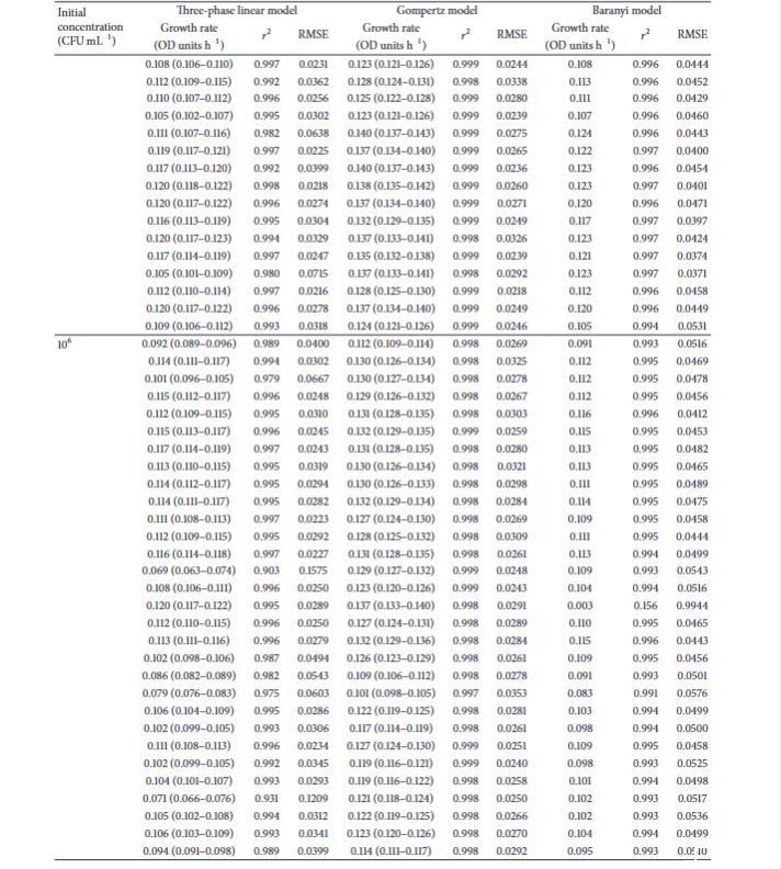 我們的結(jié)果表明,Baranyi模型和三相線性模型在分析相似生長曲線時,都為生長率值提供了較低的變異性,因此是首選模型。三相線性模型給出了生長率的最低變異,而Baranyi模型給出的變異略高,盡管其整體擬合效果要好得多。