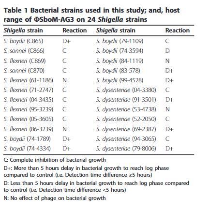 表 1 本研究中使用的細菌菌株;以及宿主 SboM-AG3 對 24 種志賀氏菌菌株的作用