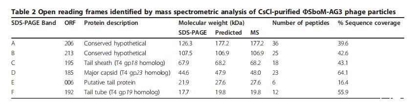 氯化銫純化的 SboM-AG3 病毒粒子通過一維 SDS-PAGE 分析,顯示出 15 個(gè)蛋白條帶(圖 4),分子量分別為 12.7、15.6、17.7、21.9、27.2、32.4、34.3、35.7、37.3、44.6、60.4、67.9、76.5、107.5 和 126.3 kDa,基于與大小標(biāo)記的比較。六個(gè)最強(qiáng)烈的條帶(命名為 A 到 F)被切下并通過 QqTOF 質(zhì)譜進(jìn)行分析。蛋白條帶 B 到 F 的觀察質(zhì)量明顯與 SDS-PAGE 預(yù)測的大小相似(表 2)。