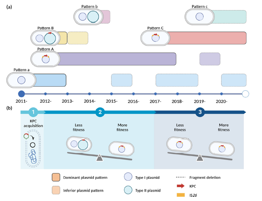 圖2、ST463-PA分離株中KPC相關(guān)質(zhì)粒的進(jìn)化過程。a在研究中,來自ST463-PA分離株的不同KPC相關(guān)質(zhì)粒模式的時間分布。每年的顯性和從屬質(zhì)粒模式分別以實(shí)線的不透明色和虛線的透明色為標(biāo)志。b關(guān)于ST463-PA分離株中KPC相關(guān)質(zhì)粒多階段進(jìn)化軌跡的提案。