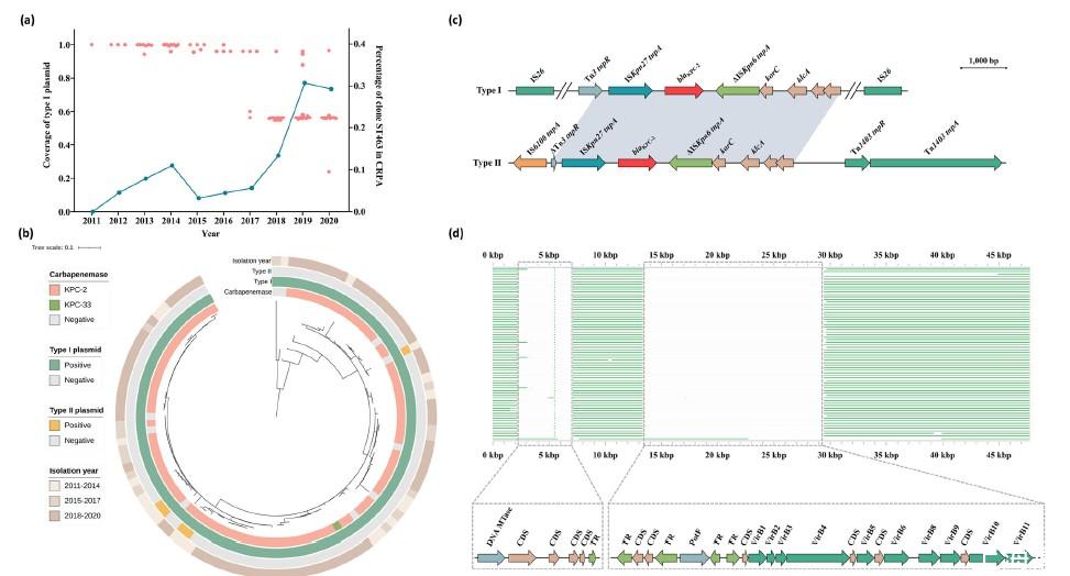 產(chǎn)肺炎碳青霉烯酶的銅綠假單胞菌(KPC-PA)分離株在中國迅速擴(kuò)增,尤其是高??寺T463。旨在探索推動ST463克隆成功的KPC相關(guān)質(zhì)粒的進(jìn)化。本研究對2011—2020年收集的1258株臨床銅綠假單胞菌菌株進(jìn)行全基因組測序,識別出106株ST463-PA菌株,其中KPC的檢出率為90.6%。研究發(fā)現(xiàn)在早期(2011—2012年),ST463-PA獲得了編碼KPC的II型(pT2-KPC)或I型質(zhì)粒(pT1-KPC)以克服碳青霉烯類抗生素的壓力。2012—2017年間,由于pT1-KPC質(zhì)粒具有較低的適應(yīng)性成本和IS26驅(qū)動的blaKPC擴(kuò)增能力,其成為主導(dǎo)質(zhì)粒。到2017—2020年,pT1-KPC質(zhì)粒發(fā)生大片段缺失,形成了pT1del-KPC質(zhì)粒。該質(zhì)粒具有更低的適應(yīng)性成本、增強(qiáng)的blaKPC-2基因穩(wěn)定性和更大的拷貝數(shù)靈活性,同時保持了水平傳播能力。因此pT1del-KPC質(zhì)粒最終取得成功,使ST463成為中國的主要ST。研究還評估了不同質(zhì)粒模式在ST463遺傳背景下的適應(yīng)性成本,并發(fā)現(xiàn)攜帶pT1del-KPC質(zhì)粒的菌株在無抗生素或高濃度美羅培南條件下比攜帶pT1-KPC質(zhì)粒的菌株具有更高的適應(yīng)性。在低濃度美羅培南壓力下,pT1del-KPC質(zhì)粒通過增加質(zhì)??截悢?shù)來放大blaKPC-2基因,而pT1-KPC質(zhì)粒則通過IS26介導(dǎo)的blaKPC-2基因擴(kuò)增來響應(yīng)。這些發(fā)現(xiàn)強(qiáng)調(diào)了進(jìn)化壓力推動ST463優(yōu)勢的形成,并強(qiáng)調(diào)了需要有針對性的策略來控制其傳播和抗生素抗性的發(fā)展。