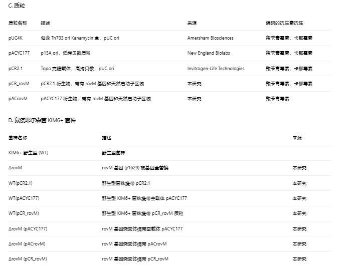 使用pKOBEG方法創(chuàng)建鼠疫耶爾森菌ΔrovM突變株,其中整個靶基因被來自pUC4K的Tn703卡那霉素盒替換。使用引物對lxmarovMf/lxbarovMr和rxbarovMf/rhindrovMr通過PCR從鼠疫耶爾森菌KIM6+基因組DNA中產(chǎn)生rovM基因的左右側(cè)翼區(qū)域。將這兩個PCR片段分別克隆到pUC19的Xmai/XbaI和XbaI/HindIII位點。使用引物kanxbaf和kanxbar擴(kuò)增卡那霉素盒,并將其克隆到含有rovM側(cè)翼區(qū)域的pUC19質(zhì)粒的XbaI位點。將新質(zhì)粒pUC19rovM500flanking用作模板,使用引物lxmarovMf和rhindrovMr生成線性PCR片段,用于pKOBEG方法進(jìn)行誘變。通過DNA測序驗證突變。ArovM::kan突變體在此簡稱為ArovM。使用引物lxmarovMf和rhindrovMr從鼠疫耶爾森菌KIM6+基因組DNA生成包含rovM基因和天然啟動子區(qū)域的片段,并將該片段克隆到高拷貝數(shù)質(zhì)粒TOPO-pCR2.1(pCR_rovM)中。然后,通過用BamHI和XhoI消化pCR_rovM質(zhì)粒分離包含rovM基因和天然啟動子區(qū)域的片段,并將其克隆到低拷貝數(shù)質(zhì)粒pACYC177(pACrovM)的相應(yīng)位點上。通過DNA測序驗證構(gòu)建體。通過電穿孔分別用pACrovM或pCR_rovM轉(zhuǎn)化ArovM突變體,以實現(xiàn)rovM突變的反式互補。用空pACYC177質(zhì)粒轉(zhuǎn)化鼠疫耶爾森菌ArovM突變體和野生型菌株,并用pCR_rovM構(gòu)建體轉(zhuǎn)化野生型菌株用于比較rovM過表達(dá)實驗。除非另有說明,所有后續(xù)實驗均使用攜帶質(zhì)粒的菌株進(jìn)行。本研究中使用的所有菌株和引物列于表1。