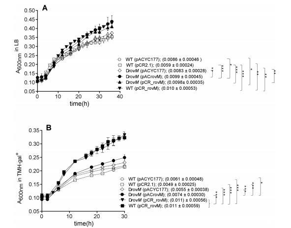 因此,評(píng)估了ΔrovM突變株在聚苯乙烯微孔板上成功產(chǎn)生生物膜的能力,與野生型、以及轉(zhuǎn)化了攜帶rovM基因的質(zhì)粒的野生型和ΔrovM突變株(野生型(pCR_rovM)、ΔrovM(pACrovM)和ΔrovM(pCR_rovM))進(jìn)行比較。ΔrovM突變體在LB(4mM MgCl2,4mM CaCl2)培養(yǎng)基中產(chǎn)生的附著生物膜量與攜帶高或低拷貝數(shù)空質(zhì)粒的野生型菌株相似。有趣的是,轉(zhuǎn)化了pCR_rovM或pACrovM的野生型和ΔrovM菌株,即它們含有多個(gè)rovM基因拷貝,似乎產(chǎn)生同樣減少的生物膜,但這歸因于較少的附著生物膜容易被洗掉。在LB培養(yǎng)基和TMH培養(yǎng)基(補(bǔ)充0.2%半乳糖)中的生長分析表明,野生型(pCR_rovM)、ΔrovM(pCR_rovM)和ΔrovM(pACrovM)的生長速率顯著快于野生型和rovM突變體。