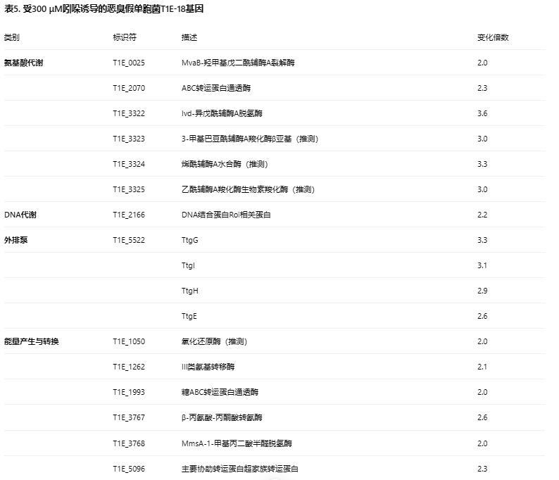 我們在T1E-18(ttgABC缺陷菌株)中進行了相同實驗:T1E-18菌株中的外排泵ttgGHI上調(diào)2.6-3.7倍(表5);且T1E-18中一些在親本菌株中未被誘導(dǎo)的基因也發(fā)生了誘導(dǎo)表達,特別是參與支鏈氨基酸代謝的基因(T1E_3322至T1E_3325、T1E_5100和T1E_5101)以及其他與氨基酸代謝相關(guān)的基因。這些結(jié)果表明,TtgABC的缺陷和TtgGHI的誘導(dǎo)會影響惡臭假單胞菌對吲哚的響應(yīng)。