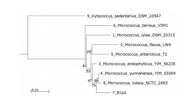 通過提交至GenBank數(shù)據(jù)庫證實了與藤黃微球菌菌株NCTC 2665的高度相似性(100%)。在鄰接系統(tǒng)發(fā)育樹中,菌株B1pz與藤黃微球菌NCTC 2665和云南微球菌(M.yunnanensis)YIM 65004的一個亞分支密切相關(guān),具有較高的自舉值(圖1)。該分離株被鑒定為藤黃微球菌(Micrococcus luteus),一種革蘭氏陽性、需氧、不形成孢子的球菌,排列成細胞四聯(lián)體并產(chǎn)生黃色色素。