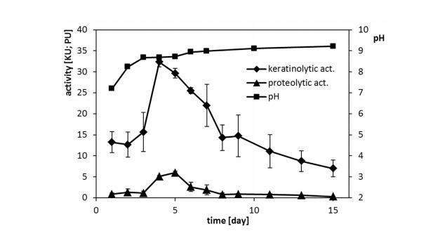 在15天的培養(yǎng)期間,藤黃微球菌B1pz菌株利用羽毛底物作為培養(yǎng)基中的主要營養(yǎng)源,同時伴隨著細胞外蛋白酶的產(chǎn)生。角蛋白分解和酪蛋白分解活性的生產(chǎn)高峰出現(xiàn)在培養(yǎng)的第四天和第五天之間,最大值分別為32.3 KU和6.0 PU(圖2)。培養(yǎng)基中的羽毛含量對目標酶的生物合成產(chǎn)生影響,影響底物利用率。在底物濃度為1-2%時,角蛋白分解活性水平相當,高于此水平時觀察到生物合成顯著下降(表1)。