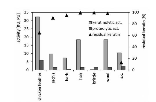 藤黃微球菌B1pz菌株除了能夠有效分解雞羽毛底物外,還能在各種角蛋白材料存在下生長和生產(chǎn)角蛋白酶。在人發(fā)或羔羊毛上培養(yǎng)物中觀察到的最大角蛋白分解活性水平,與雞羽毛培養(yǎng)基相比降低了約50%(圖4)。分離的鴕鳥羽毛羽軸和羽枝被證明是效果差得多的角蛋白酶誘導物,而在含有豬鬃的培養(yǎng)基中未檢測到角蛋白酶活性。測試的菌株在雞羽毛上生長時優(yōu)先產(chǎn)生角蛋白分解酶,而不是在其他高彈性的"硬角蛋白"上,這也反映了在短短4天培養(yǎng)期內(nèi)底物分解程度達到35.3%。表皮角質(zhì)層作為富含細胞角蛋白的"軟"角蛋白的例子,盡管對細菌生物降解具有高度敏感性,但對測試菌株來說仍然是一個中等強度的角蛋白酶誘導物。