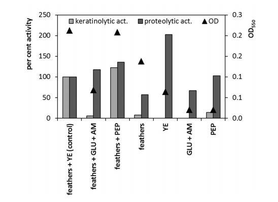 盡管如此,在2%羽毛含量時,酪蛋白分解蛋白酶的生產(chǎn)出現(xiàn)輕微刺激。向羽毛培養(yǎng)基中添加額外的補充劑也是角蛋白酶生產(chǎn)的關(guān)鍵因素。與含有羽毛和酵母提取物的對照培養(yǎng)基相比,添加蛋白胨導致最大角蛋白分解活性刺激了22%(圖3)。葡萄糖幾乎完全抑制了角蛋白酶的生產(chǎn),但不影響蛋白水解活性。羽毛誘導物的存在對角蛋白酶的生物合成至關(guān)重要,但對酪蛋白分解蛋白酶則不然。然而,測試菌株在羽毛培養(yǎng)基中沒有任何補充劑的情況下無法產(chǎn)生顯著的角蛋白酶水平。