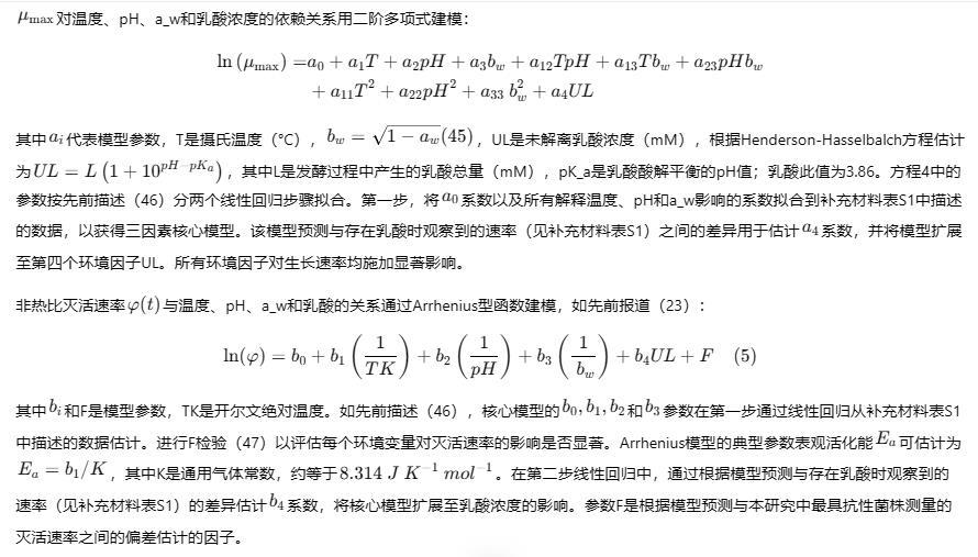 需要時(shí),通過將Baranyi和Roberts模型擬合生長曲線來估計(jì)最大比生長速率,而熱和非熱比滅活速率則從滅活曲線線性部分的斜率估計(jì),該曲線表示為濃度自然對(duì)數(shù)對(duì)時(shí)間的關(guān)系。