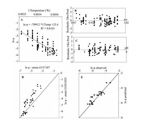 為研究未解離乳酸濃度對(duì)大腸桿菌非熱滅活的影響,我們生成了一套新的數(shù)據(jù)集,包含96條存活曲線,涉及兩種大腸桿菌血清型(O157:H7和O103:H25),在多種乳酸濃度、溫度、pH和a_w組合下進(jìn)行。這兩種血清型滅活速率的比較表明,大腸桿菌O103:H25的衰減速率顯著高于O157:H7(P值<0.0001)。大腸桿菌O157:H7表現(xiàn)出更強(qiáng)的抗滅活能力,尤其是在低pH條件下。初始的非熱滅活模型在最苛刻條件下預(yù)測(cè)的滅活速率快于該菌株的實(shí)際觀測(cè)值。因此,我們對(duì)模型進(jìn)行了修正,使其能夠基于本研究中發(fā)現(xiàn)的抗性最強(qiáng)的菌株(O157:H7)來預(yù)測(cè)VTEC的存活情況。修正方法是在模型中引入一個(gè)因子F,該因子根據(jù)模型預(yù)測(cè)值與O157:H7實(shí)測(cè)滅活速率之間的偏差計(jì)算得出。利用該菌株生成的數(shù)據(jù)也用于通過乳酸影響項(xiàng)擴(kuò)展VTEC的非熱滅活模型。