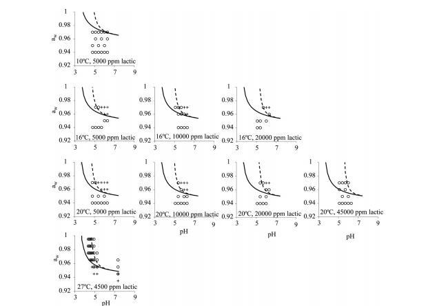 為探究模型在不同乳酸濃度、溫度、pH和a_w組合下的性能,本研究生成了一套新的數(shù)據(jù)集??傮w而言,包含乳酸影響項(xiàng)的擴(kuò)展模型預(yù)測(cè)結(jié)果與獨(dú)立生成的生長/不生長數(shù)據(jù)吻合良好。估計(jì)擴(kuò)展模型(含乳酸項(xiàng))的預(yù)測(cè)與觀測(cè)響應(yīng)之間的一致性百分比為86%,而原始模型(不含乳酸項(xiàng))的一致性為77%。