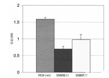 刪除hk11或rr11基因?qū)е律锬ば纬扇毕?,如圖3所示。菌株SMHK11的生物膜密度約為親本菌株NG8的50%,菌株SMRR11的密度約為親本菌株的75%。觀察到的突變體生物膜密度降低不太可能是由于它們略微降低的生長(zhǎng)速率所致,特別是因?yàn)樗鼈冊(cè)谥行詐H下的生長(zhǎng)產(chǎn)量與親本菌株在TYEG(圖2)和SDM培養(yǎng)基(數(shù)據(jù)未顯示)中幾乎相同。
