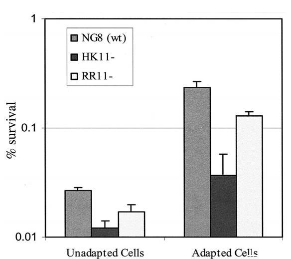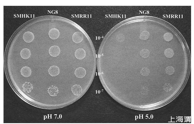 與親本菌株NG8相比,SMHK11和SMRR11突變體在pH 5.5的液體培養(yǎng)物中均顯示出生長(zhǎng)速率降低。NG8的Td為100±1分鐘。SMHK11的Td為178±3分鐘,而SMRR11每207±9分鐘倍增一次(圖2)。突變體SMHK11在pH 5.0的瓊脂平板上的生長(zhǎng)也大大減弱,盡管它在pH 7.0的平板上(圖5)和pH 7.0的肉湯中(圖2)生長(zhǎng)與親本菌株一樣好。有趣的是,我們未能在pH 5.0平板上檢測(cè)到SMRR11突變體與親本菌株NG8生長(zhǎng)之間的差異。為了更仔細(xì)地確定刪除hk11或rr11基因是否影響可誘導(dǎo)的ATR,我們使用先前描述的方法測(cè)定了在液體培養(yǎng)物中生長(zhǎng)的突變體的對(duì)數(shù)期ATR。結(jié)果顯示,SMHK11突變體相對(duì)于親本菌株NG8具有降低的ATR(圖6)。然而,刪除rr11僅導(dǎo)致可誘導(dǎo)ATR輕微下降,如菌株SMRR11所示。