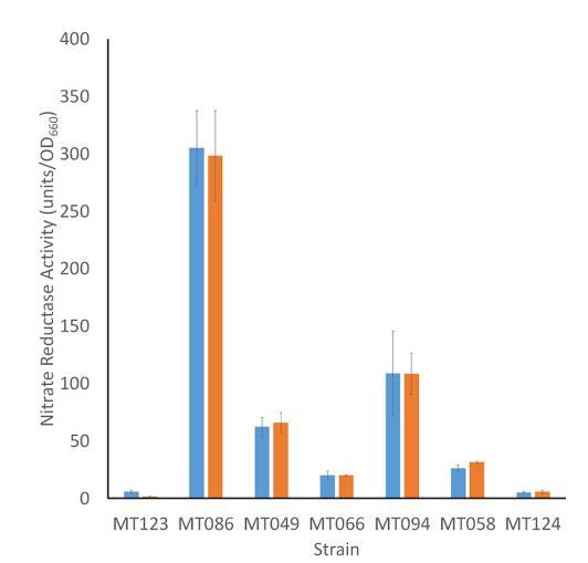 對四種革蘭氏陽性菌株(MT066、MT086、MT094和MT124)觀察到特定硝酸鹽還原活性和亞硝酸鹽耐受性(高達80 mM)之間的逆線性關(guān)系(r2>0.99)。由于這些菌株都沒有亞硝酸鹽還原酶活性,一種解釋是較高硝酸鹽還原產(chǎn)生亞硝酸鹽速率的菌株tuned在電子供體有限環(huán)境中生存,其中硝酸鹽和亞硝酸鹽競爭高,預計都不會積累。