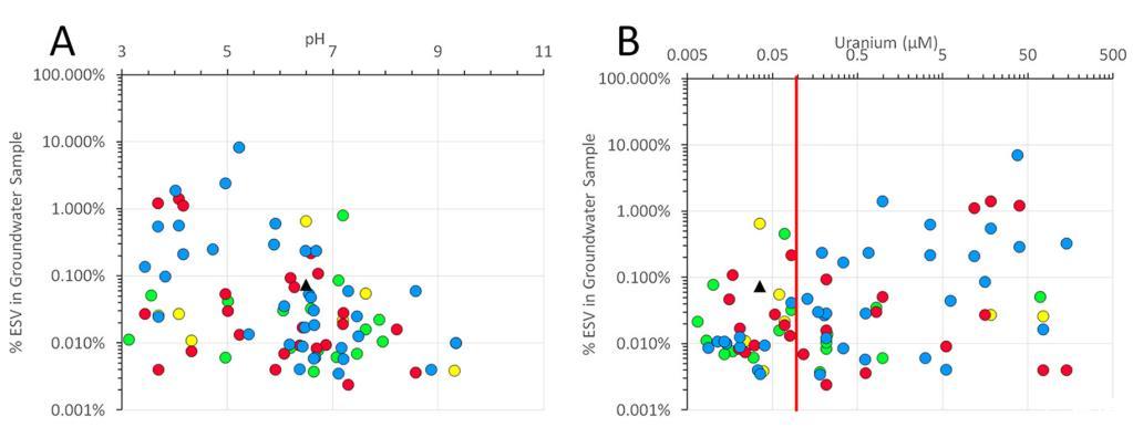 如圖4所示,所有五種ORR菌株的ESV匹配發(fā)現(xiàn)在井中跨越寬范圍pH值(從3.1到10.4)(圖4A)和鈾濃度(0.007到143μM)(圖4B)。實際上,對于所有在多個井中發(fā)現(xiàn)的四種菌株(MT049、MT058、MT094和MT123),每種都在未污染(pH~7.0,U<;0.126μM)和高度污染井(pH<4.0,U>70μM)中發(fā)現(xiàn)。
