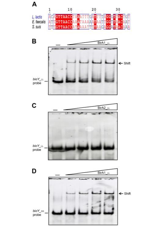 為了測試預測的BirA位點功能(圖8A和9A),進行了電泳遷移率變動分析(EMSA),使用純化的BirA1_LL和BirA2_LL(圖9B-D)。EMSA證實BirA1_LL以劑量依賴性方式有效結(jié)合bioY1探針(圖9B),而缺乏推定的N端DNA結(jié)合基序的BirA2_LL不結(jié)合探針(圖2和9C)。有趣的是,豬鏈球菌bioY(bioY_ss)啟動子能夠與乳酸乳球菌BirA1_LL相互作用(圖9D)。在豬鏈球菌BirA的情況下也發(fā)現(xiàn)了類似情況,它也能結(jié)合乳酸乳球菌bioY啟動子。因此,我們預期豬鏈球菌和乳酸乳球菌的bioY和BirA之間存在串擾。鑒于BirA1和bioY1啟動子之間發(fā)生相互作用,而bioY2缺乏預測的BirA1結(jié)合位點,探究這種調(diào)控機制與生物素同化的生理相關(guān)性可能很有意義。