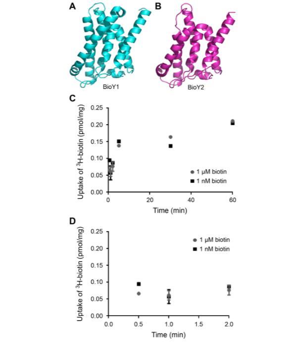 針對已解析的BioY結(jié)構(gòu)的結(jié)構(gòu)建模表明,BioY1_LL(圖10A)和BioY2_LL(圖10B)均由七個α-螺旋組成,并在整體構(gòu)型上表現(xiàn)出明顯相似性。鑒于乳酸乳球菌編碼兩個BioY轉(zhuǎn)運蛋白,我們假設它能夠進行強大的生物素轉(zhuǎn)運。乳酸乳球菌培養(yǎng)物在限制生物素或過量生物素(1 nM或1μM)存在下生長4.5小時,離心沉淀并用PBS洗滌以去除游離生物素,用于3H-生物素轉(zhuǎn)運測定(圖10C,D)。在測量時間間隔內(nèi),生物素耗竭培養(yǎng)物(預測產(chǎn)生兩種BioY轉(zhuǎn)運蛋白)和生物素充足培養(yǎng)物(預測僅需單一轉(zhuǎn)運蛋白)的3H-生物素相對轉(zhuǎn)運相似。樣品之間的微小差異僅在初始轉(zhuǎn)運時間點觀察到(圖10D)。相反,在一分鐘及以后,生物素的攝取/積累大致相等(圖10C)。似乎測試的外源生物素增量并未顯著增強生物素攝取活性。