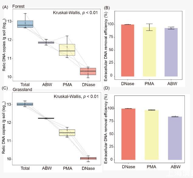 圖6.基于不同核酸提取方法的標簽胞外DNA拷貝數(shù)和去除效率(A)森林生態(tài)系統(tǒng)中不同核酸提取方法下標簽胞外DNA的拷貝數(shù);(B)森林生態(tài)系統(tǒng)中不同核酸提取方法下標簽胞外DNA的去除率;(C)草原生態(tài)系統(tǒng)中不同核試驗提取方法下標簽胞外DNA的拷貝數(shù);(D)草原生態(tài)系統(tǒng)中不同核酸提取方法下標簽胞外DNA的去除率。Total:總DNA提取;DNase:DNase預消化;ABW:堿性緩沖液洗滌;PMA:疊氮溴化丙錠(PMA)處理。
