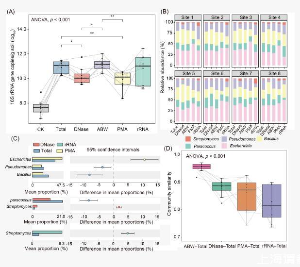 圖5.不同核酸提取方法所表征的模擬微生物類群的多度和群落結構(A)土壤16S rRNA基因拷貝數(shù);(B)模擬土壤微生物群落的結構;(C)總微生物和活體微生物類群的相對多度差異,差異通過t檢驗揭示;(D)總DNA提取和不同土壤活體微生物研究方法所表征模擬群落結構的相似性。Total:總DNA提?。籇Nase:DNase預消化;ABW:堿性緩沖液洗滌;PMA:疊氮溴化丙錠(PMA)處理;rRNA:rRNA直接表征。