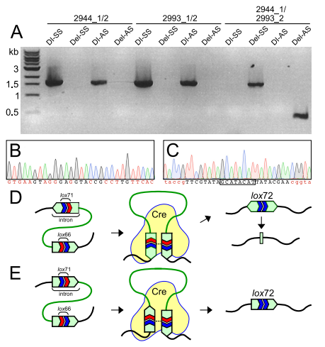 圖3、Cre介導(dǎo)的基因組缺失。(A)PCR檢測cphy2944(引物2944_1/2)、cphy2993(引物2993_1/2)及38.9 kb區(qū)域(引物2944_1/2993_2),比較pQcre1轉(zhuǎn)化前(DI-SS、DI-AS)與轉(zhuǎn)化后(Del-SS、Del-AS)。(B-C)Del-AS中內(nèi)含子片段(B)和Del-SS中l(wèi)ox72位點(diǎn)(C)的DNA測序色譜圖,紅色標(biāo)出回文位置或中央間隔。(D-E)Cre介導(dǎo)lox71與lox66之間基因組缺失模型:Del-AS株為雙向內(nèi)含子重組成28-bp內(nèi)含子片段(無lox72),Del-SS株為單向內(nèi)含子(含lox72)。