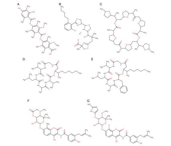 圖2.文中討論的化合物的化學(xué)結(jié)構(gòu):(A)thielavin B;(B)micacocidin B;(C)IKD-8344;(D)CL0231;(E)CL0236;(F)新生霉素;和(G)氯新生霉素。結(jié)構(gòu)使用Marvin Sketch v.14.12.8繪制。